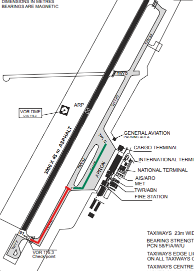 "TOM1VY, Runway 01 Taxi via E, B, A1, Caution Taxiway width"