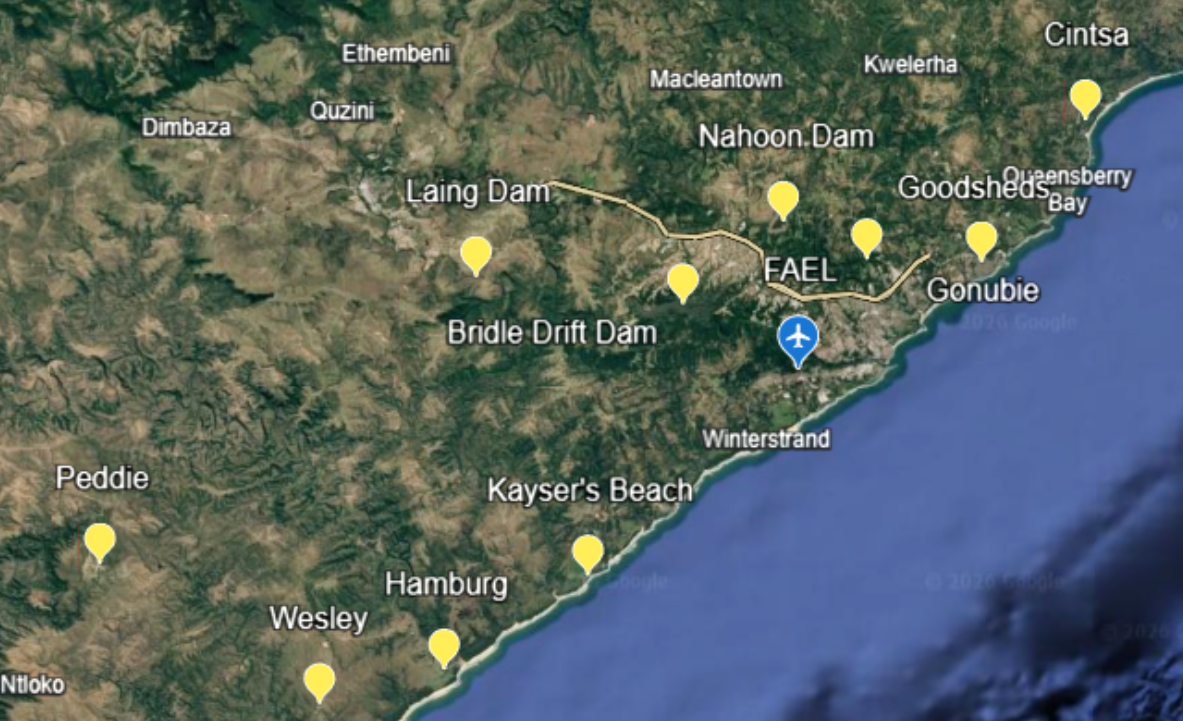 The responsibility of Tower at King Phalo falls to the dedicated Tower ATS unit, "East London Tower" (FAEL_TWR) on 118.300. TWR will be responsible for the movements on the runway, as well as the responsibility of ensuring safety amongst VFR aircraft operating in the circuit or within the King Phalo CTR from GND - 2500ft MSL.