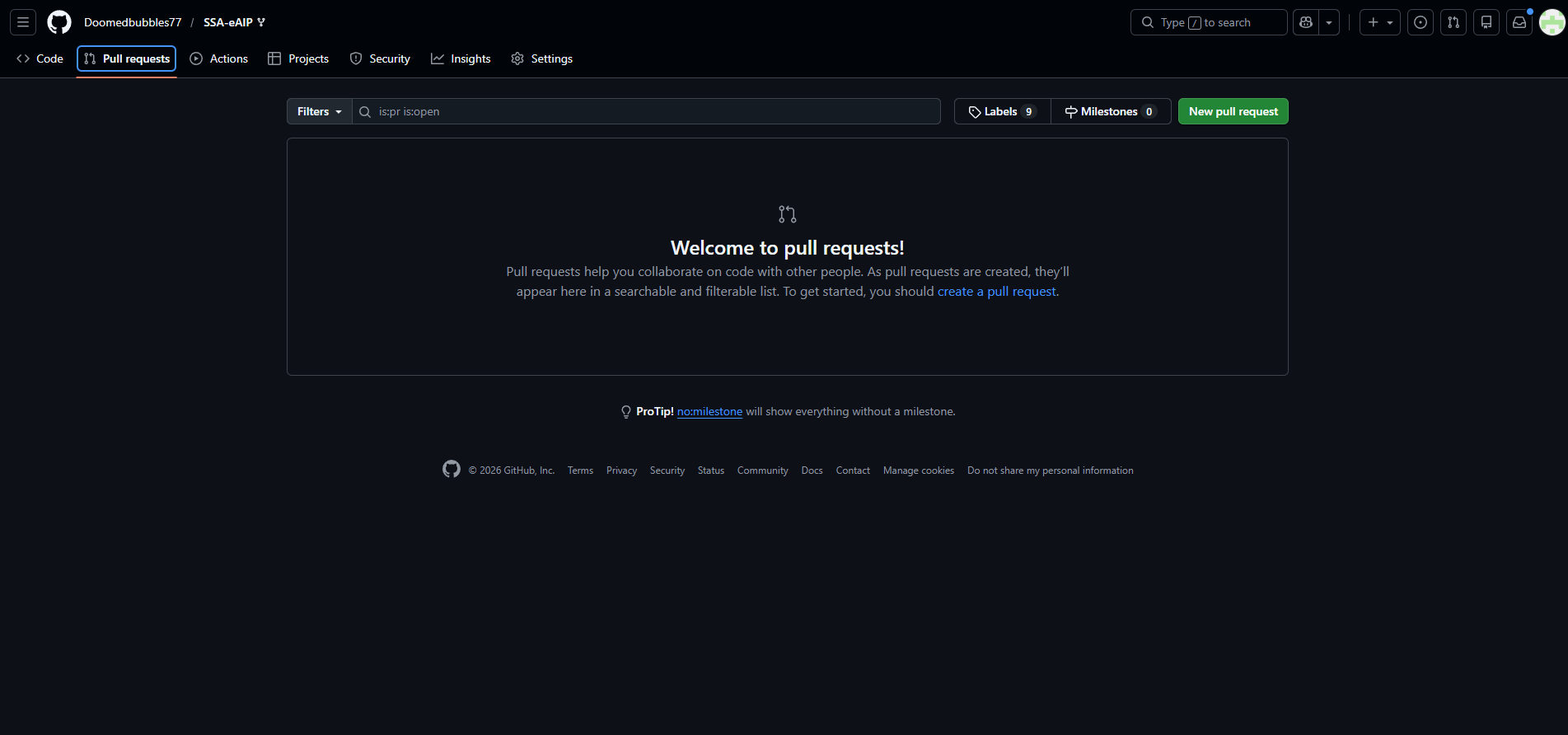 - Now we have the pull requests page open. We can click "New pull request" in the top right.