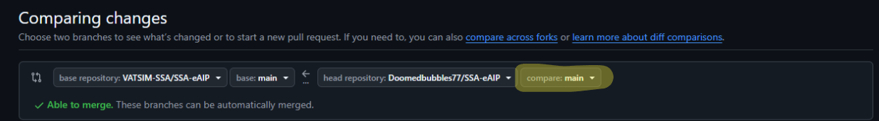 Click on the "compare:main" button. We can now select the branch we want to submit. In our case we have been using "FACT-eAIP." So select the branch labeled "FACT-eAIP."