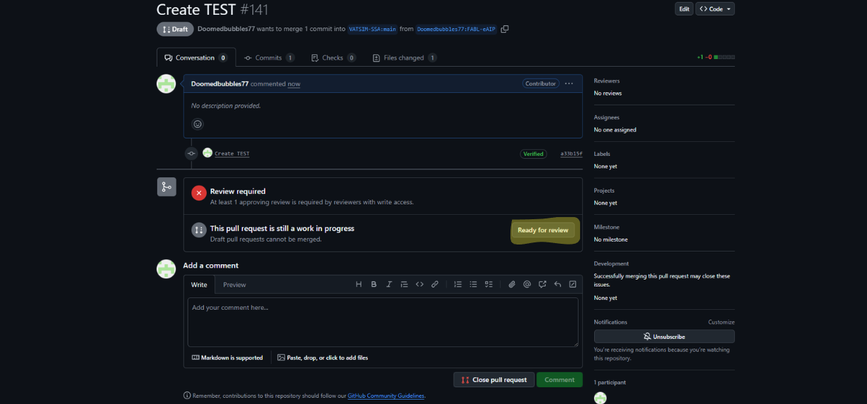 Once you click "ready for review," your pull request will be submitted to the head repository.