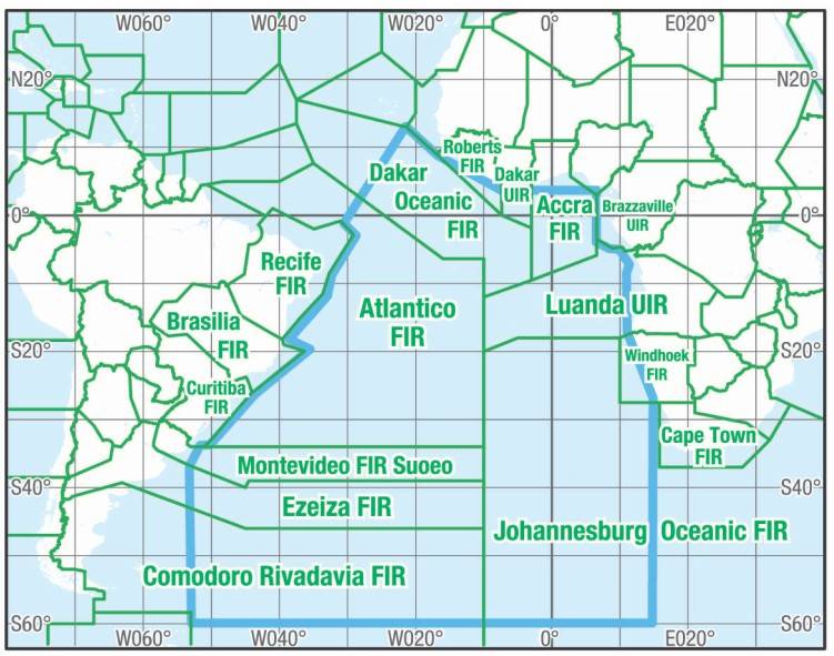 The Atlantic Ocean Random Routing RNAV Area (AORRA) is the volume of airspace between FL290 and FL410 inclusive within the Atlantico, Accra, Comodoro Rivadavia, Dakar, Dakar Oceanic, Ezeiza, Johannesburg Oceanic, Luanda, and Montevideo FIRs as depicted on the map below: