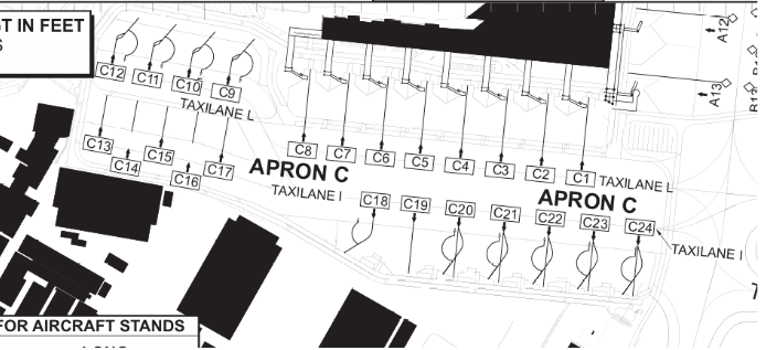 Stands C1-C8, and C18-C24 are able to hold Code C aircraft (B737, A320s etc), whereas C9-C17 are used for Code B aircraft (ERJ135, other smaller aircraft).