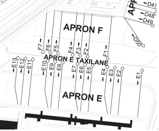 Stands E2, E4, E5, E7, E8, E10, E11, E13, F2, F4, F7 are only suitable for Code C aircraft. Bays E1 and F1 can be used up to Code E aircraft. Code E3, E6, E9 and E12 are suitable for Code F aircraft.