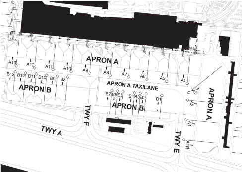 Aprons A and B are used for a mix of both international and domestic traffic: